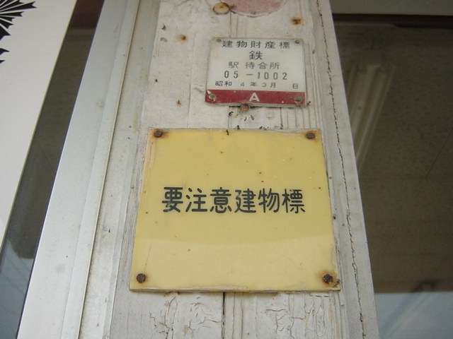 08/15/11:38 七尾線横山駅駅舎は要注意建物???七尾線にある横山駅は、明治34年開業で、駅舎は昭和4年建築の木造駅舎が残っているんだけど、駅出入口の柱にある財産標を見たら、その下に変なパネルが・・・「要注意建物標」と記載されているの。